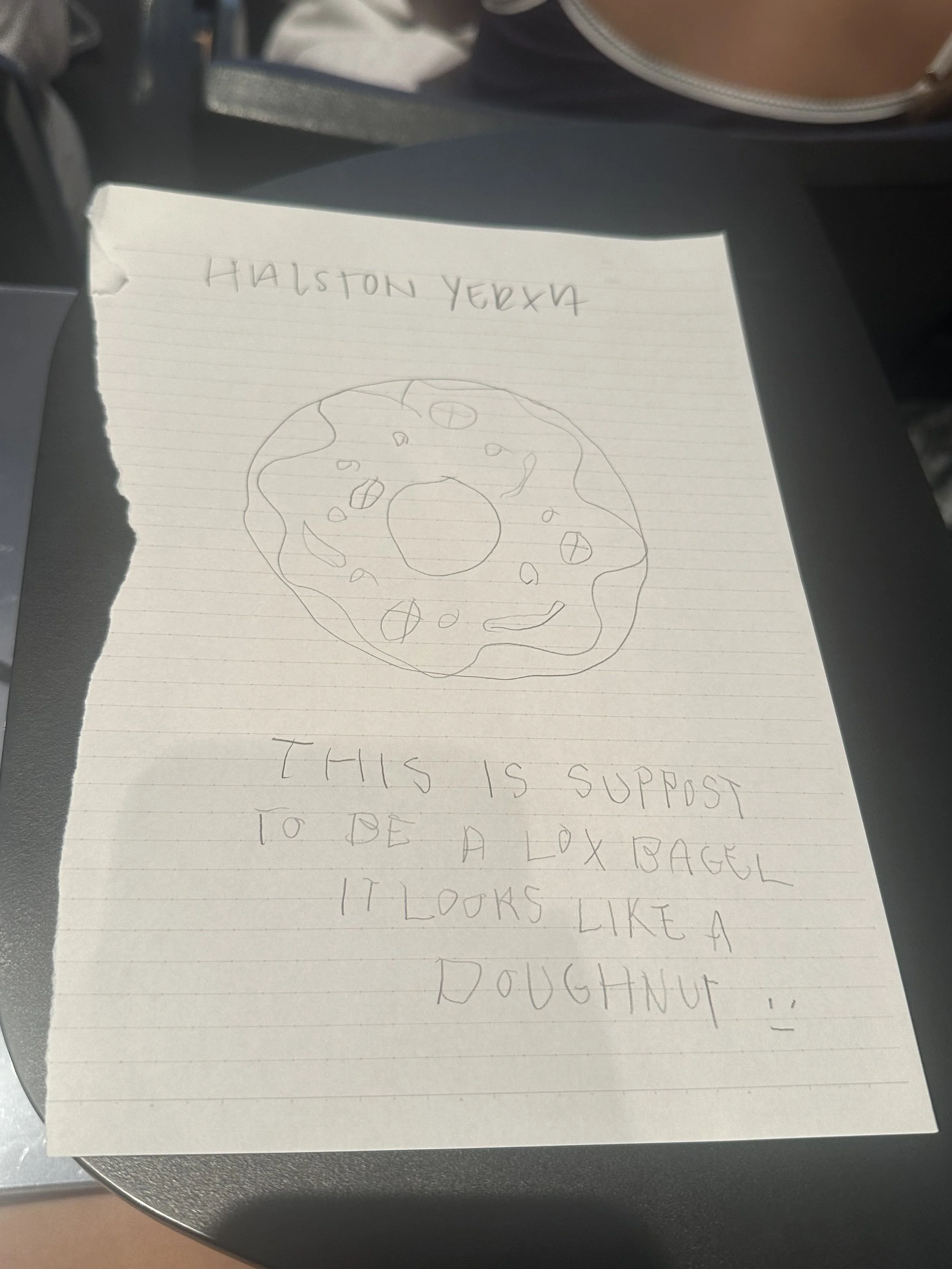 What I ate for breakfast drawn with my left hand. Lox bagel from Sadelles. 6/10. It looked like a doughnut. I had to look up how to spell the word doughnut.